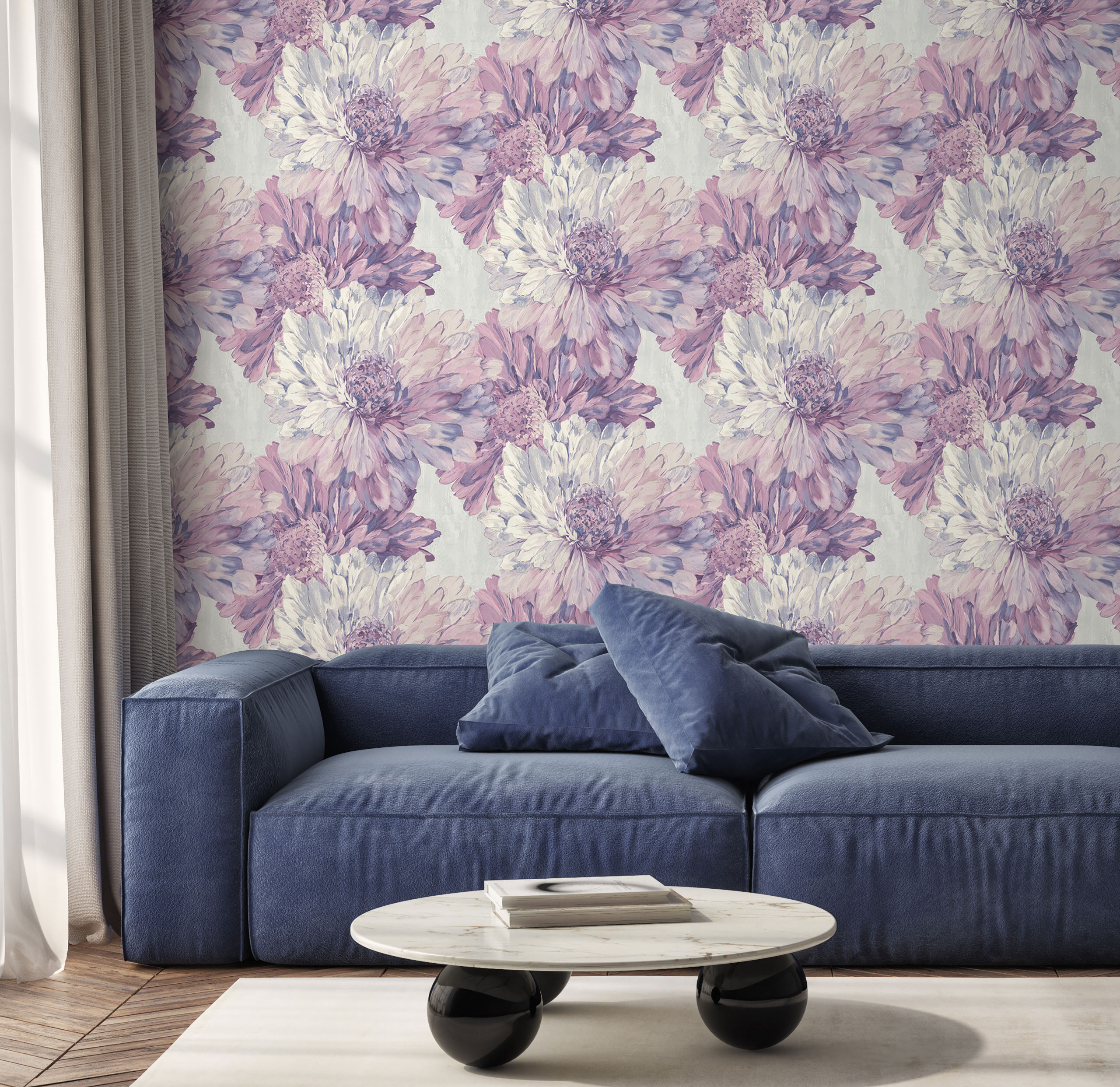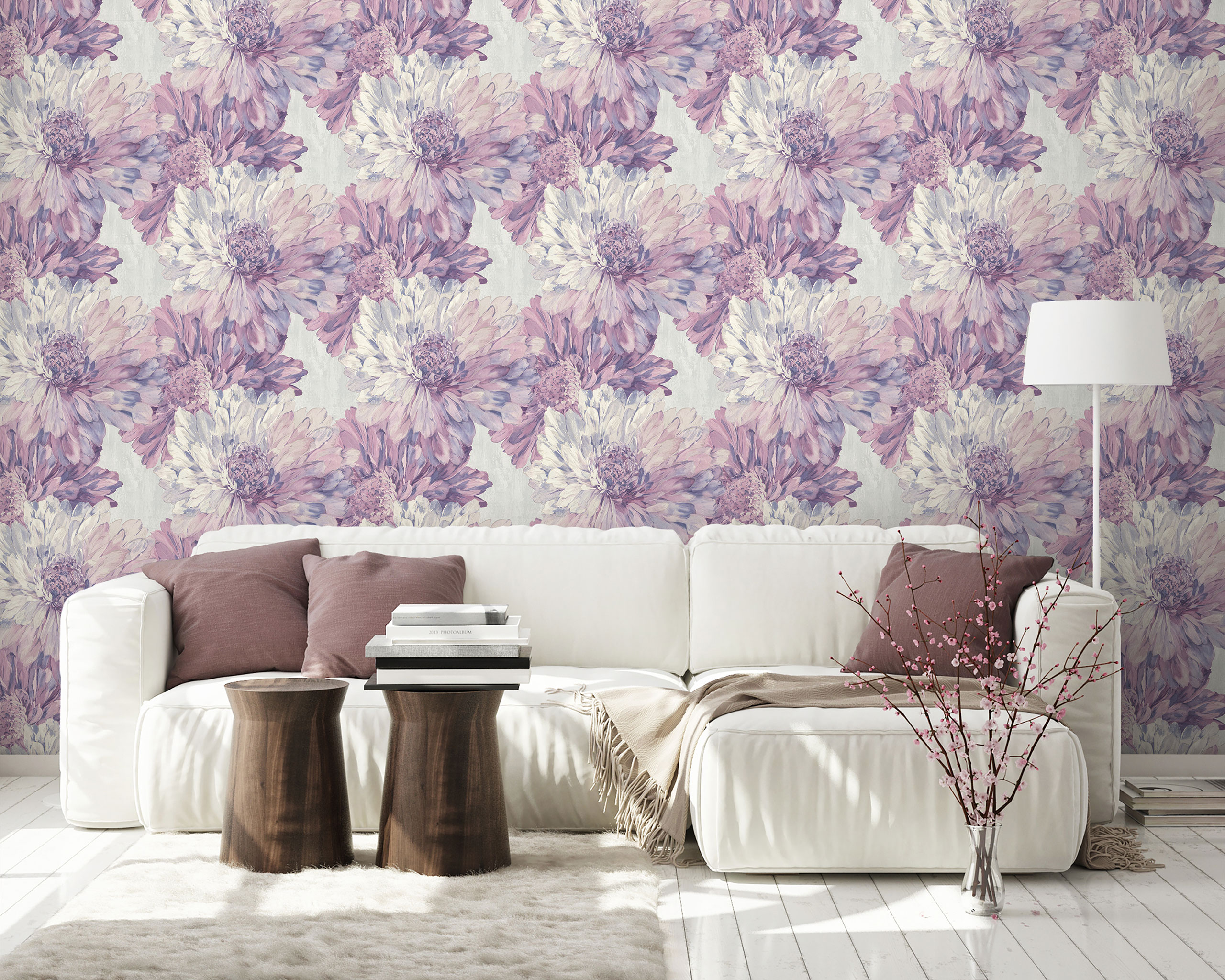 Главным акцентом мотива коллекции стали крупные цветки с пышными лепестками. Словно звезды они являются центральным элементом всей композиции. Благодаря масштабу и живописной технике сочетания цветов, бутоны выглядят впечатляюще и эффектно! За счет тончайшего тиснения сами лепестки прорисованы с ювелирной детализацией прожилок, словно это слепок настоящего растения. Их контуры очерчены деликатным металликом, а внутренние части подсвечены мерцающей пудрой и перламутром. Такие визуальные эффекты в полной мере раскрывают дизайнерскую задумку — передать красоту цветущего бутона. Задний план мотива, как и фон коллекции «Stella», имитирует поверхность декоративной штукатурки, еще больше проявляя изысканность и нежность основного рисунка. Колористики коллекции заслуживают отдельного внимания. Яркие цветовые сочетания и роскошные монохромы — здесь каждый сможет найти нужный акцент для своего интерьера.