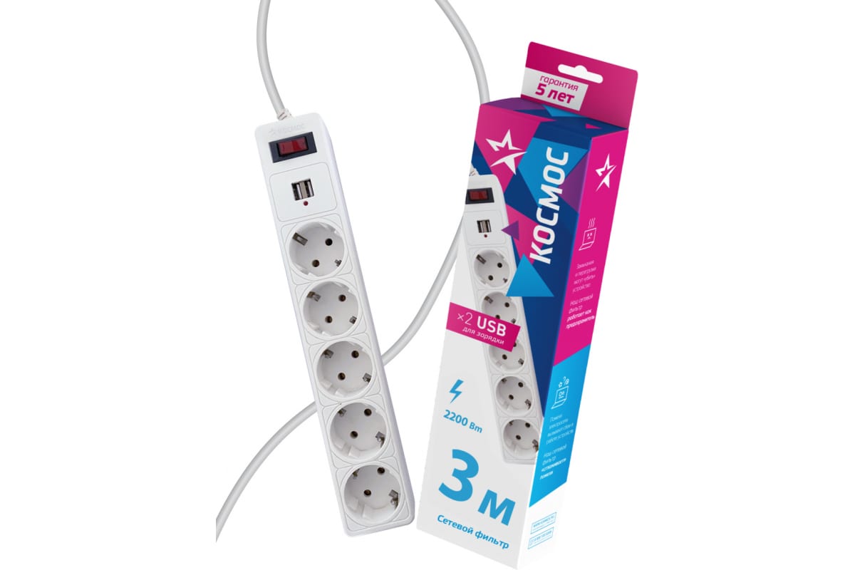 —Сетевой фильтр с 5 гнездами + 2USB 3м с выключателем с заземлением 10A 220В 4,5кА белый